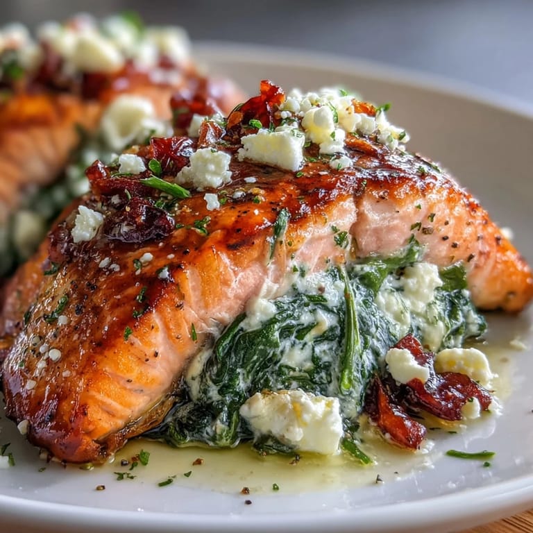 Save to Pinterest There's a moment when you're standing at the fishmonger's counter, watching the light catch the salmon's silvery skin, and you suddenly know exactly what dinner should be. That was me on a Thursday afternoon, thinking about how to turn something simple into something that felt special without spending hours in the kitchen. The spinach and feta filling came to me like a whisper from a Mediterranean vacation I'd taken years before, and I realized right then that this combination belonged inside that beautiful piece of fish.