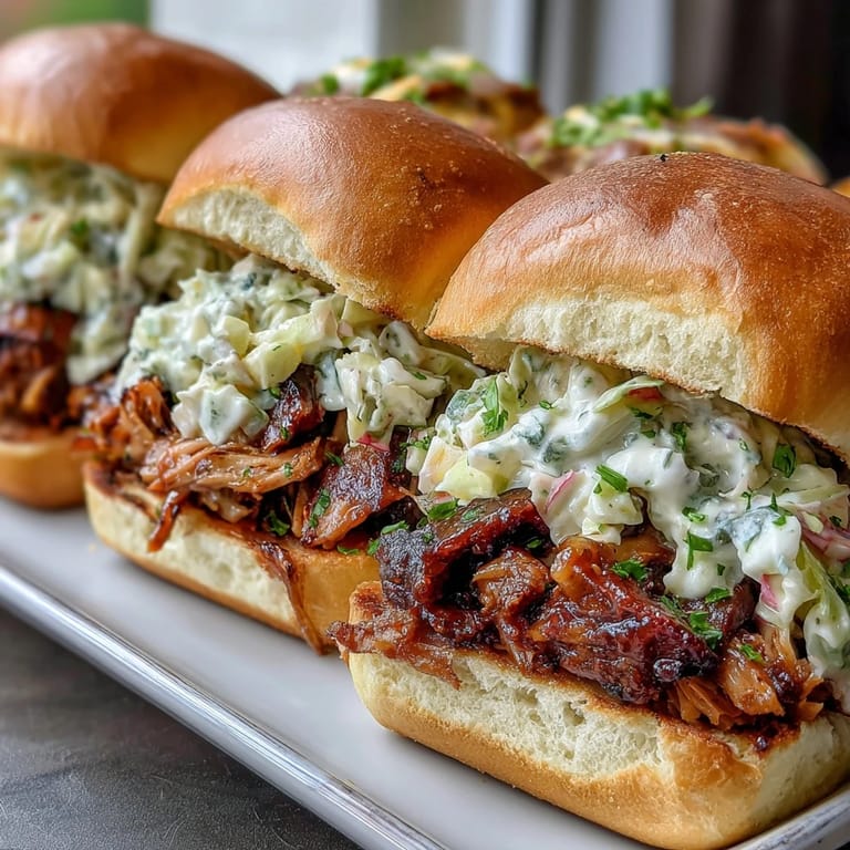 I've learned to cook the pork the day before and reheat it gently in the slow cooker on warm for an hour before serving—it's more forgiving than cooking it fresh on event day and racing against time. The coleslaw holds in the refrigerator for up to two days without becoming soggy if you wait to dress it until a few hours before guests arrive. Assemble the sliders just before serving so the buns stay soft and the coleslaw stays crisp instead of seeping into the bread.