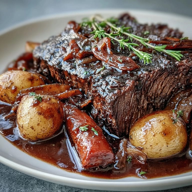 Save to Pinterest The smell of beef browning in butter is one of those kitchen anchors that pulls me right back into the moment. I was wearing an old apron, standing over a too-hot burner, and the edges of that chuck roast were crackling louder than I expected. My partner walked in, sniffed the air, and said, "Whatever that is, double it." I hadn't even added the wine yet.