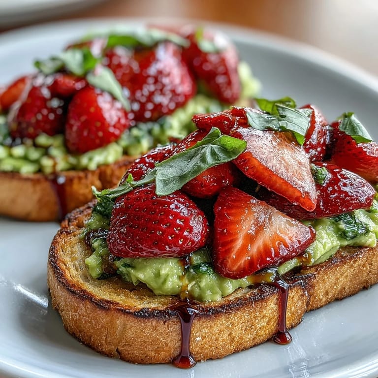 The magic of this toast lies in the unexpected harmony of its toppings. Ripe avocados, mashed with fresh lime juice and a whisper of red chili flakes, form a lush, verdant base. The strawberries, tossed with a touch of honey and thin ribbons of fresh basil, bring a bright sweetness that plays perfectly against the avocado's richness. And that balsamic glaze—reduced from just balsamic vinegar and honey until syrupy and deep—ties everything together with a sophistication that feels special without being fussy. This is the kind of dish that makes guests ask for the recipe before they've even finished their first slice.
