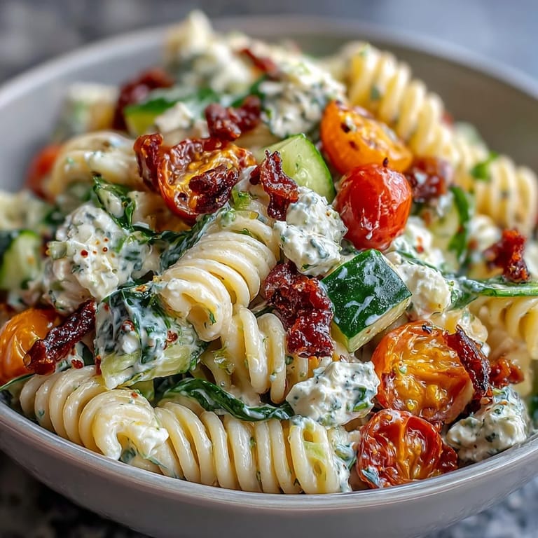 Before serving, stir the salad well to redistribute the dressing. If the pasta has absorbed too much moisture while chilling, add a small splash of dressing or fresh lemon juice to refresh the flavors.