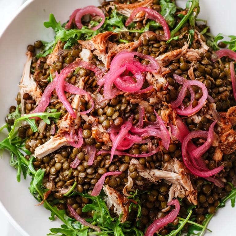 Save to Pinterest I first threw this salad together on a Tuesday evening when the refrigerator was full of random containers and I needed something that felt intentional but took zero brain power. The lentils were leftover from Sunday meal prep, the chicken was from a rotisserie bird Id picked up on impulse, and those pickled onions had been sitting in a jar for weeks waiting for their moment. When I took the first bite, something magical happened the creamy mustard hit the peppery arugula, the sweet tomatoes balanced the tangy onions, and suddenly a clean out the fridge dinner became the dish I started craving on repeat.