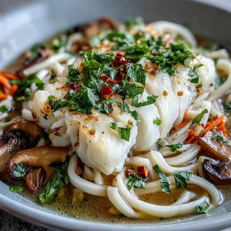 Save to Pinterest I was craving something warm and clean one rainy Tuesday, digging through my pantry when I spotted a can of coconut milk and a jar of red curry paste I'd nearly forgotten. There was cod in the fridge, udon noodles in the cupboard, and suddenly I was building a broth that smelled like a street market in Bangkok. The whole thing came together faster than I expected, steam curling up from the pot, filling the kitchen with ginger and lime. By the time I sat down with that first bowl, I knew this was going to be one of those recipes I'd come back to again and again.