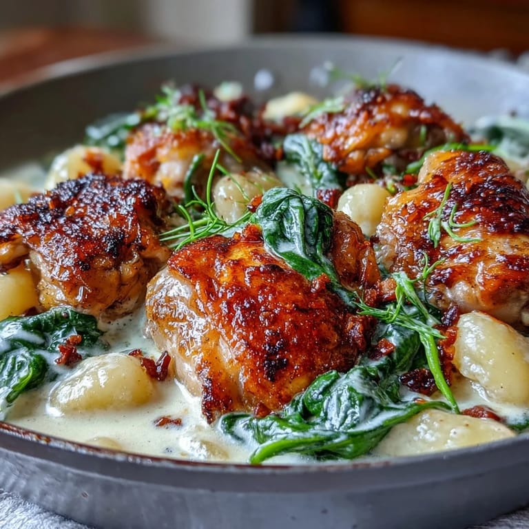 Save to Pinterest There's something magical about the moment when a skillet transforms into a complete meal. One Tuesday evening, I was standing in my kitchen with half an hour before guests arrived, staring at chicken thighs and a box of gnocchi, when it struck me: why dirty multiple pans when one could do it all? The result was this creamy garlic chicken gnocchi, a dish that's become my secret weapon for looking effortlessly put-together. That first bite—the tender chicken, pillowy gnocchi swimming in silky sauce—made everyone forget I'd started cooking mere minutes before they knocked on the door.