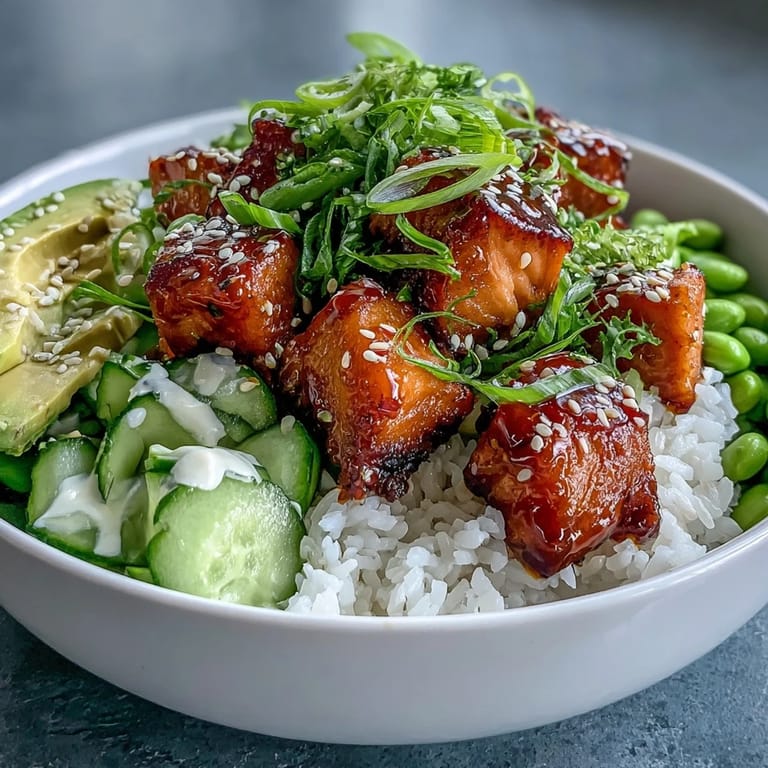 Save to Pinterest There's something about assembling a salmon rice bowl that makes a weeknight feel like you've got your life together. I discovered this particular combination on a Tuesday when I had salmon thawing, leftover jasmine rice, and an avocado that was finally ripe enough to use. The marinating step takes barely any time, but somehow the soy-ginger-sesame mixture transforms simple cubes of fish into something restaurant-worthy. What started as ingredient improvisation became the meal I actually look forward to making.